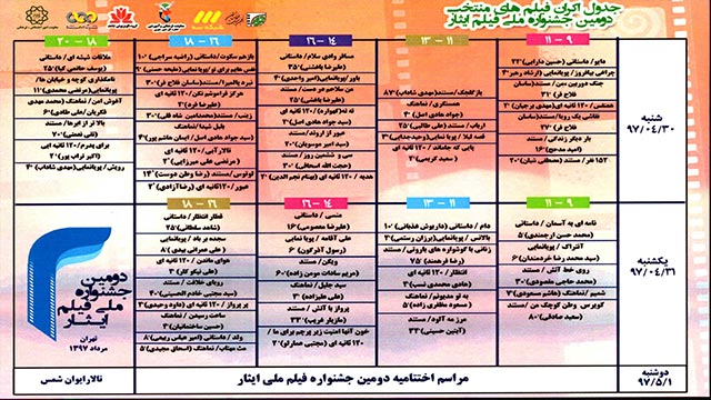 به گزارش آیفیلم، برپایه برنامه زمان بندی شده اکران فیلم ها در دو روز متوالی سی ام و سی یکم تیرماه 1397 در 5 سانس «9-11»، «11-13»، «14-16»، «16-18» و «18- 20» در مرکز فرهنگی «اسوه» رایگان صورت می گیرد.