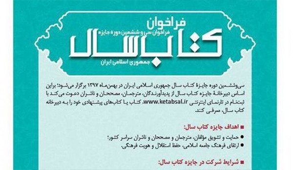 دبیرخانه جایزه کتاب سال از پدیدآورندگان، مترجمان، مصححان و ناشران دعوت کرده با ثبتنام در تارنمای اینترنتی www.ketabsal.ir، کتاب یا کتابهای پیشنهادی خود را به دبیرخانه کتاب سال معرفی کنند.