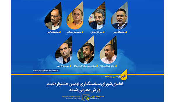به گزارش آی فیلم و به نقل از روابط عمومی نهمین جشنواره، حجتالله ایوبی دبیرکل کمیسیون ملی یونسکو، محمود شالویی مدیرکل فرهنگ و ارشاد اسلامی استان مازندران، مهرداد زاهدیان مستندساز، محمدعلی سجادی کارگردان و فیلمنامهنویس، محمدمهدی طباطبایینژاد مدیرعامل مرکز گسترش سینمای مستند و تجربی و جعفر صانعیمقدم مدیرعامل هنر و تجربه اعضای شورای سیاستگذاری نهمین جشنواره فیلم وارش را تشکیل میدهند.