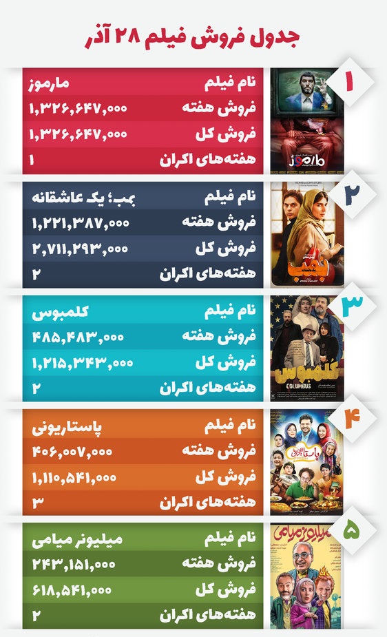 به گزارش آیفیلم، فیلم «مارموز» به کارگردانی کمال تبریزی در هفته اول اکران توانست در صدر پرفورشها قرار گیرد، در رده دوم «بمب؛ یک عاشقانه» اثر جدید پیمان معادی قرار گرفته که هفته دوم اکران را پشت سرگذاشته است.