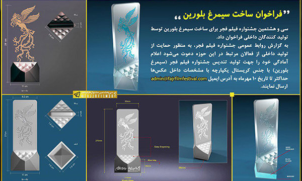 علاقه مندان می توانند طرح های خود را برای تولید تندیس جشنواره فیلم فجر (سیمرغ بلورین) با جنس کریستال یکپارچه با مشخصات داخل عکس ها حداکثر تا تاریخ ۱۰ مهرماه به آدرس ایمیل admin@fajrfilmfestival.com ارسال کنند.