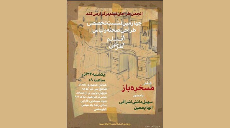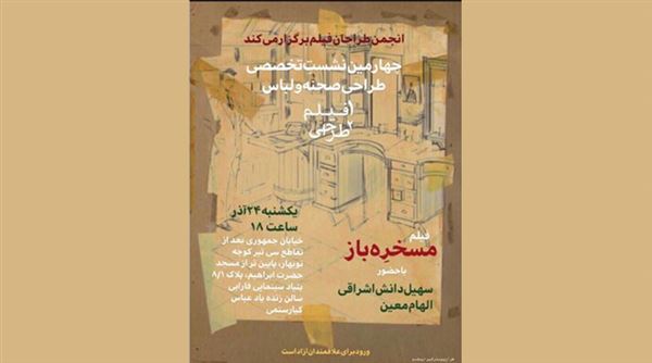 چهارمین نشست «یک فیلم دو طراحی» قرار است با حضور سهیل دانش اشراقی طراح صحنه و الهام معین طراح لباس فیلم «مسخرهباز» ساعت ۱۸ یکشنبه۲۴ آذر در سالن زندهیاد عباس کیارستمی بنیاد سینمایی فارابی برگزار شود.