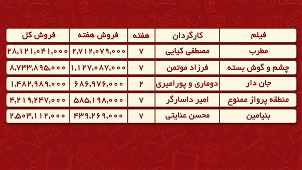 جدول فروش سینمای ایران در هفته گذشته را در برنامه سینما آیفیلم این هفته را ببینید.