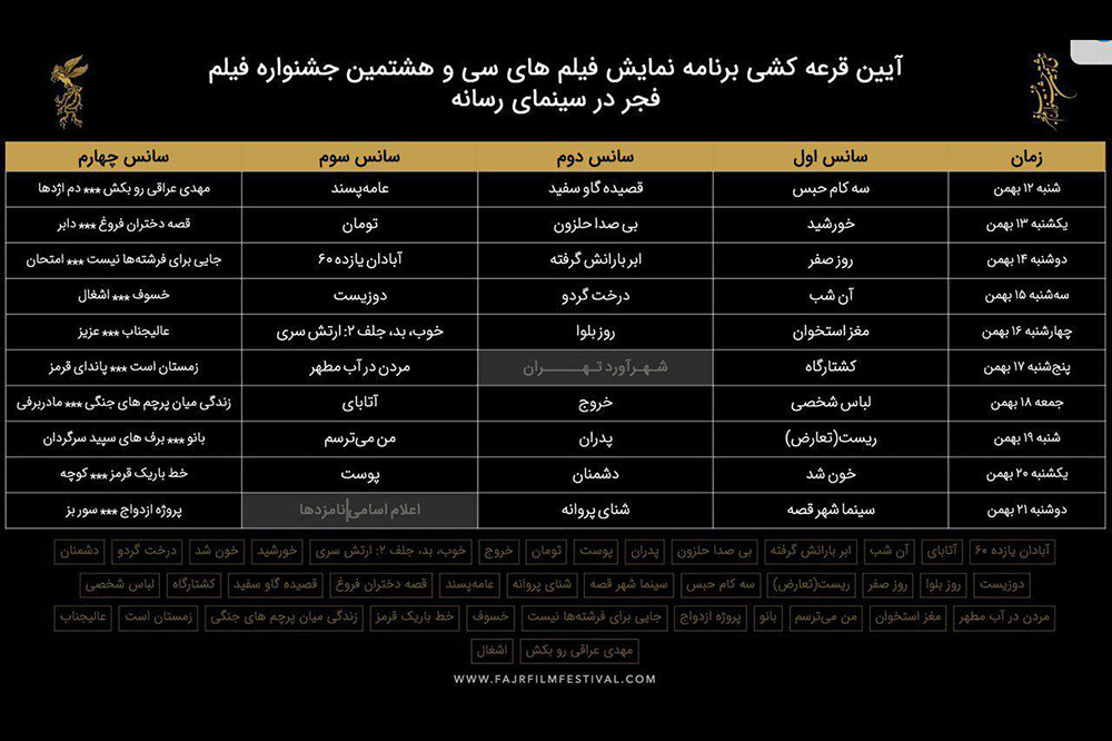 بر اساس قرعه «خورشید» ساخته مجید مجیدی یکشنبه ۱۳ بهمن در سانس اول، «دشمنان» ساخته علی درخشنده ۲۰ بهمن در سانس دوم، «سینما شهر قصه» ساخته کیوان علیمحمدی ۲۱ بهمن در سانس اول، «من می ترسم» ساخته بهنام بهزادی ۱۹ بهمن سانس سوم، «لباس شخصی» ساخته امیرعباس ربیعی ۱۸ بهمن سانس اول، «ابر بارانش گرفته» ساخته مجید برزگر دوشنبه ۱۴ بهمن سانس دوم، «خون شد» ساخته مسعود کیمیایی ۲۰ بهمن سانس اول، «مردن در آب مطهر» به کارگردانی نوید محمودی پنجشنبه ۱۷ بهمن در سانس سوم، «روز بلوا» ساخته بهروز شعیبی ۱۶ بهمن در سانس دوم، «کشتارگاه» ساخته عباس امینی ۱۷ بهمن سانس اول، «عامه پسند» ساخته سهیل بیرقی ۱۲ بهمن سانس سوم، «خروج» ساخته ابراهیم حاتمیکیا ۱۸ بهمن سانس دوم، «ریست» به کارگردانی محمدرضا لطفی شنبه ۱۹ بهمن سانس اول، «پوست» ساخته برادران ارک ۲۰ بهمن سانس سوم، «روز صفر» ساخته سعید ملکان ۱۴ بهمن سانس اول، «قصیده گاو سفید» ساخته بهتاش صناعیها ۱۲ بهمن سانس دوم، «پدران» ساخته سالم صلواتی ۱۹ بهمن سانس دوم، «بی صدا حلزون» ساخته بهرنگ دزفولی زاده ۱۳ بهمن سانس دوم، «سه کام حبس» ساخته سامان سالور ۱۲ بهمن سانس اول، «شنای پروانه» ساخته محمد کارت ۲۱ بهمن سانس دوم، «درخت گردو» ساخته محمدحسین مهدویان ۱۵ بهمن سانس دوم، «دوزیست» ساخته برزو نیکنژاد ۱۵ بهمن سانس سوم، «تومان» ساخته مرتضی فرشباف ۱۳ بهمن سانس سوم، «آن شب» ساخته کوروش آهاری ۱۵ بهمن در سانس اول، «خوب بد جلف ۲ ارتش سری» ساخته پیمان قاسمخانی ۱۶ بهمن سانس سوم، «آبادان یازده ۶۰» ساخته مهرداد خوشبخت ۱۴ بهمن سانس سوم، «مغز استخوان» ساخته حمیدرضا قربانی ۱۶ بهمن سانس اول و «آتابای» ساخته نیکی کریمی ۱۸ بهمن سانس سوم اکران اکران می شوند.