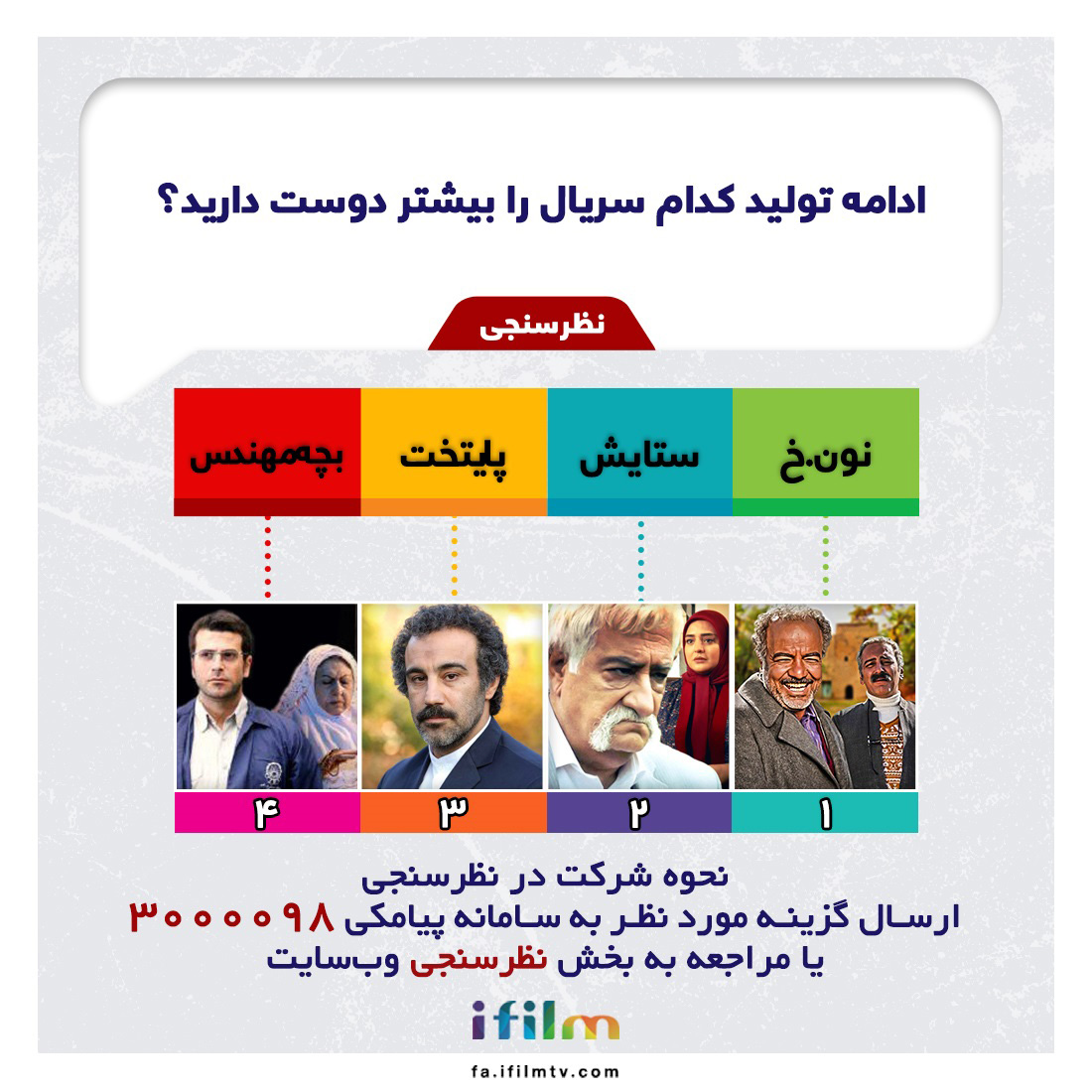همچنین، در تازهترین نظرسنجی آیفیلم فارسی از علاقمندی شما برای ادامه تولید سریال محبوبتان سوال کردیم. در این نظرسنجی پرسیده شد: «ادامه تولید کدام سریال را بیشتر دوست دارید؟»؛ که گزینههای مطرح شده برای این نظرسنجی به ترتیب زیر است: