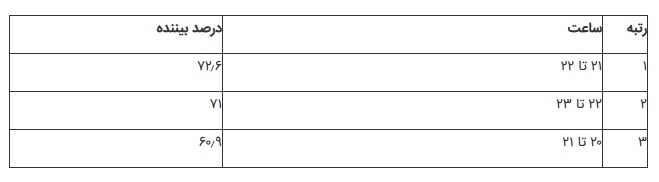 بر اساس نظرسنجی مرکز تحقیقات صداوسیما، پربینندهترین ساعت در شبانهروز برای تماشای تلویزیون در بهار ۹۹ و ۹۸ ساعت ۲۱ تا ۲۲ بوده است، با این تفاوت که در بهار ۹۹ به میزان بینندگان ۸٫۶ درصد افزوده شده است. بر اساس نتایج بهدستآمده از این نظرسنجی، پربینندهترین ساعات تماشای تلویزیون در فصل بهار به شرح زیر بوده است: