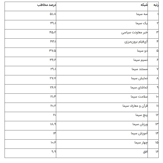 نتیجه نظرسنجی مرکز تحقیقات رسانه ملی نشان میدهد که شبکههای سه سیما، یک سیما، خبر معاونت سیاسی، آیفیلم معاونت برونمرزی و دو سیما بیشترین مخاطب را در فصل بهار داشتهاند که جزئیات آن در جدول زیر ارائه میشود: