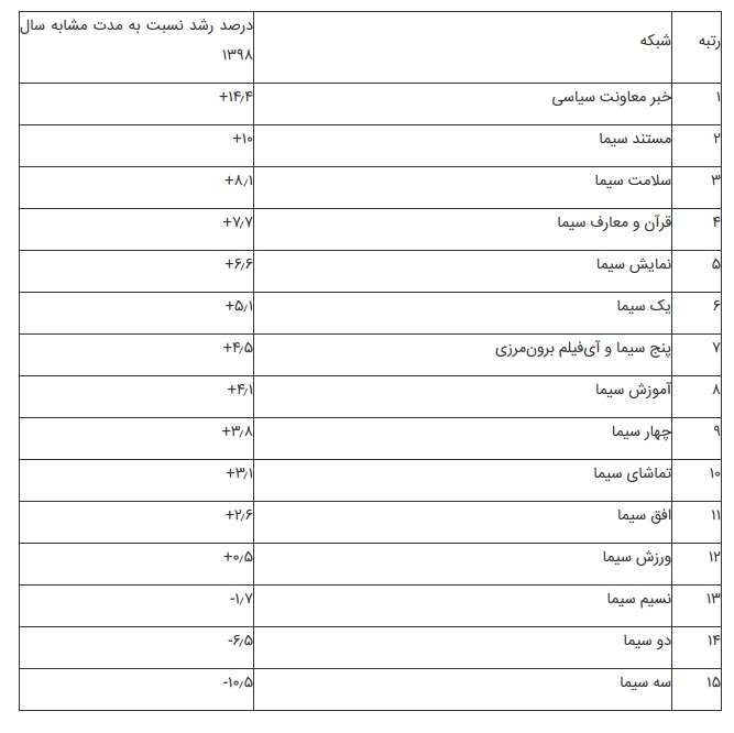 به گزارش آیفیلم به نقل از پایگاه اطلاع رسانی سیما، بر این اساس شبکه خبر معاونت سیاسی با ۱۴٫۴ درصد رشد نسبت به میزان بیننده در فصل بهار ۹۸ در صدر شبکههای تلویزیونی از منظر رشد مخاطب قرار گرفت. بعد از شبکه خبر، شبکههای مستند، سلامت، قرآن و معارف، نمایش و یک سیما به ترتیب با ۱۰، ۸٫۱، ۷٫۷، ۶٫۶ و ۵٫۱ درصد رشد نسبت به بهار ۹۸ در رتبههای دوم تا ششم قرار گرفتند.