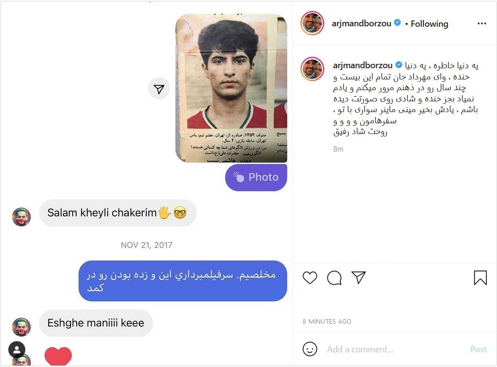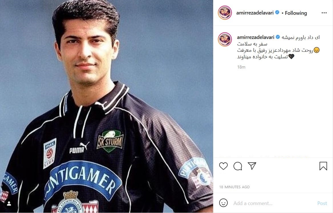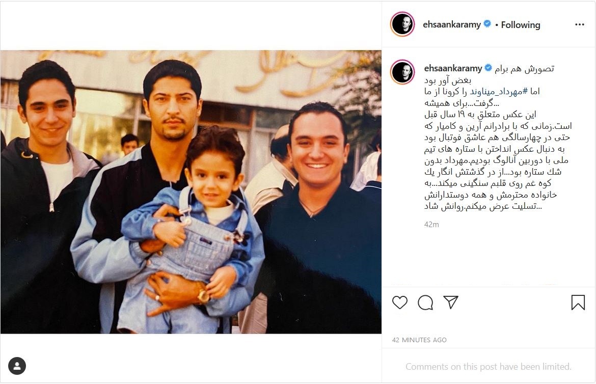 این عکس متعلق به ١٩ سال قبل است. زمانی که با برادرانم آرین و کامیار که حتی در چهارسالگی هم عاشق فوتبال بود به دنبال عکس انداختن با ستارههای تیم ملی با دوربین آنالوگ بودیم. مهرداد بدون شک ستاره بود... از در گذشتش انگار یک کوه غم روی قلبم سنگینی میکند... به خانواده محترمش و همه دوستدارانش تسلیت عرض میکنم. روانش شاد...