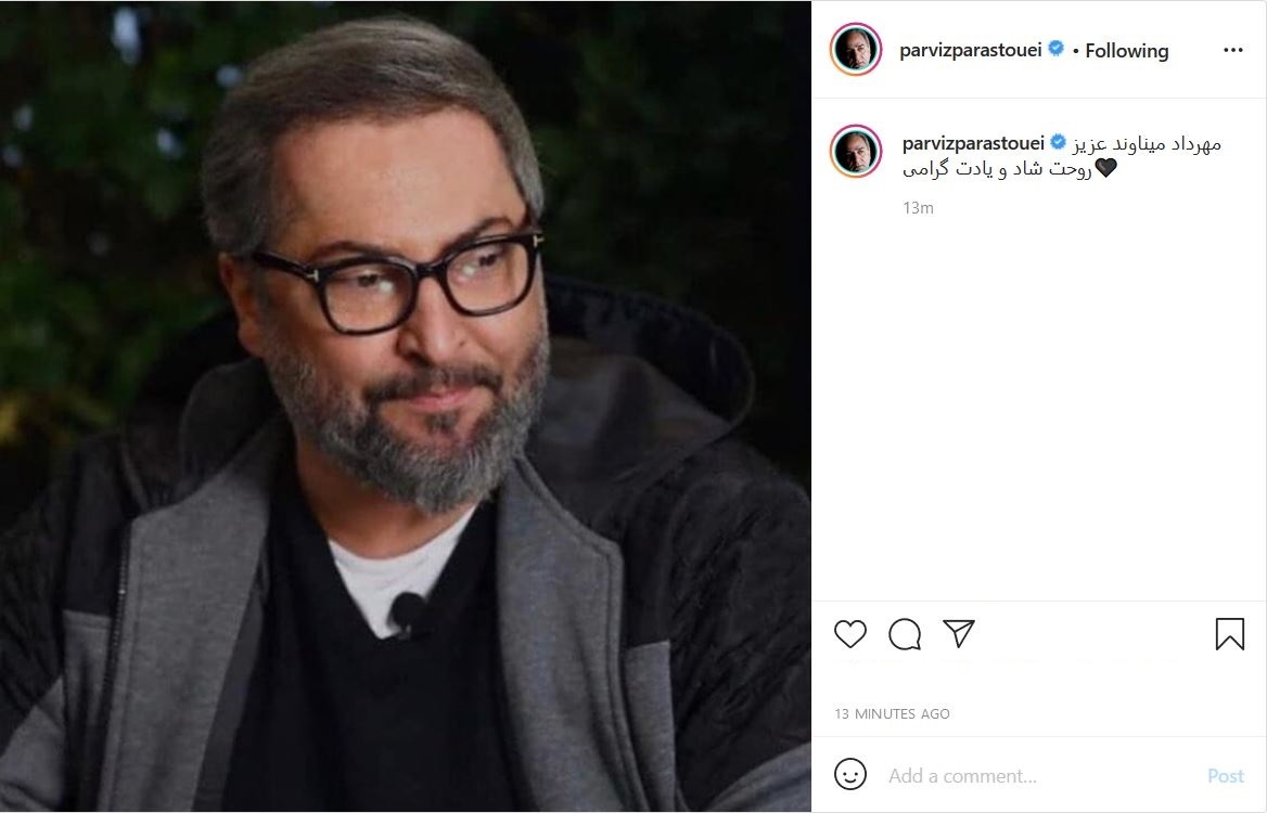 پرویز پرستویی نیز با انتشار پستی در اینستاگرام فوت نابهنگام مهراد میناوند را تسلیت گفت.