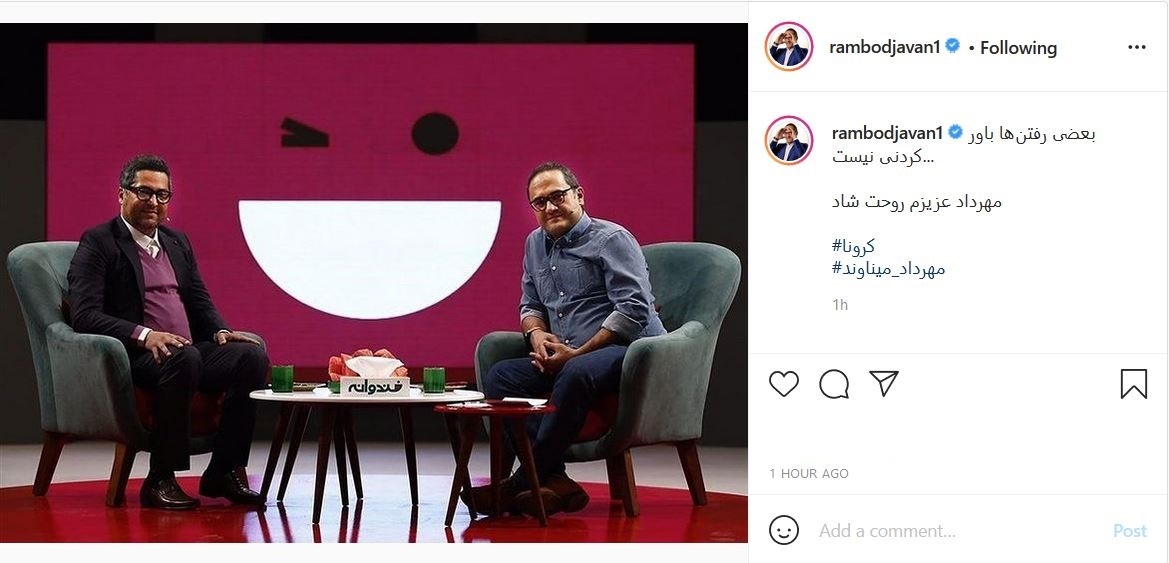 رامبد جوان هم با انتشار عکسی از مهرداد میناوند در خندوانه نوشت: