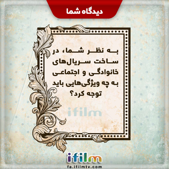 به گزارش آیفیلم، سوال جدید بخش دیدگاه شما با این عنوان منتشر شد: «به نظر شما، در ساخت سریالهای خانوادگی و اجتماعی به چه ویژگیهایی باید توجه کرد؟».