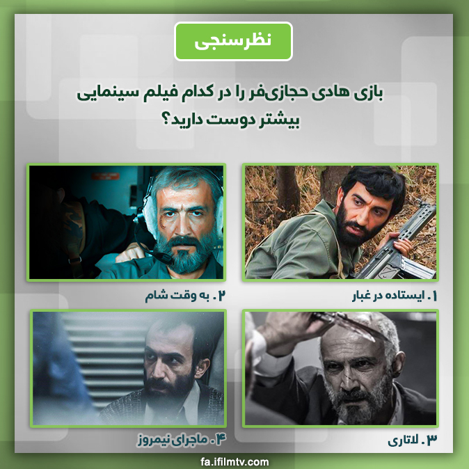 به گزارش آیفیلم، نظرسنجی جدید آیفیلم فارسی درباره فیلمهایی که هادی حجازیفر در آنها به ایفای نقش پرداخته، اختصاص دارد. در این نظرسنجی پرسیده شده: «بازی هادی حجازیفر را در کدام فیلم سینمایی بیشتر دوست دارید؟» و گزینههای مطرح شده برای این نظرسنجی به ترتیب زیر است:
