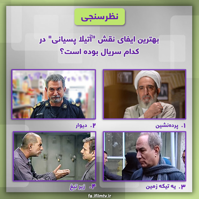 با شرکت در نظرسنجی جدید شبکه آیفیلم، نظر خود را درباره بهترین ایفای نقش "آتیلا پسیانی"، با ما در میان بگذارید.