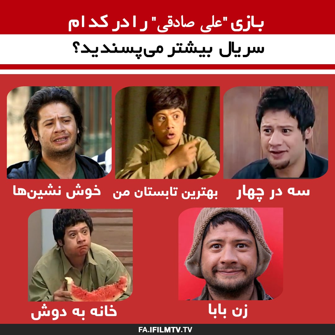 به گزارش آیفیلم، نظرسنجی جدید آیفیلم به بهترین نقش آفرینی "علی صادقی" در مجموعههای تلویزیونی اختصاص یافته است. در این نظرسنجی از مخاطبان شبکه آیفیلم پرسیده شده: بازی "علی صادقی" را در کدام سریال بیشتر میپسندید؟