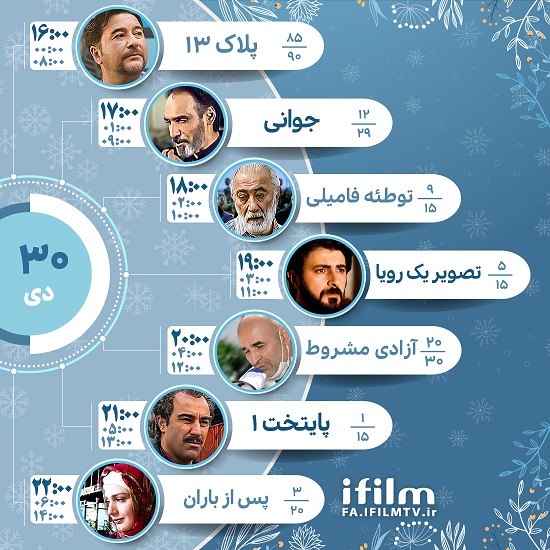 به گزارش آیفیلم، سریالهای «پلاک ۱۳»، «جوانی»، «توطئه فامیلی»، «برسر دوراهی»، «آزادی مشروط»، «پایتخت» و «بانوی عمارت» در حال پخش از شبکه آیفیلم هستند که در جدول زیر خواهید دید چند قسمت از این سریالها پخش شده و چند قسمت باقی مانده است.