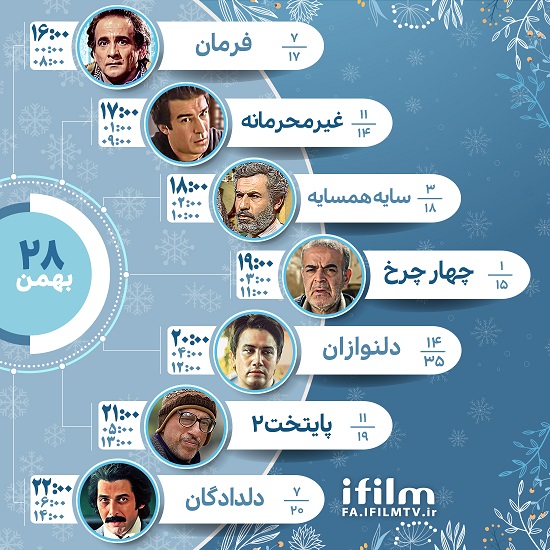 به گزارش آیفیلم، سریالهای «فرمان، «غیرمحرمانه»، «سایه همسایه»، «چهار چرخ»، «دلنوازان»، «پایتخت» و «دلدادگان» در حال پخش از شبکه آیفیلم هستند که در جدول زیر خواهید دید چند قسمت از این سریالها پخش شده و چند قسمت باقی مانده است.